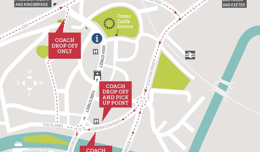 The main drop off points for coaches in Totnes are the two bus stops on Coronation Road. There is an additional drop off point at The Lamb at the top of town, which allows your passengers to walk downhill through the town. FREE coach parking bays can be found at the South Hams District Council-run car park at Steamer Quay Car Park.