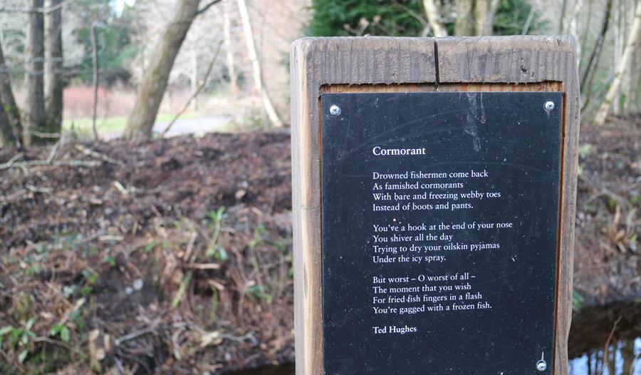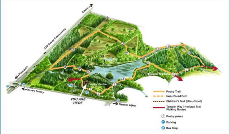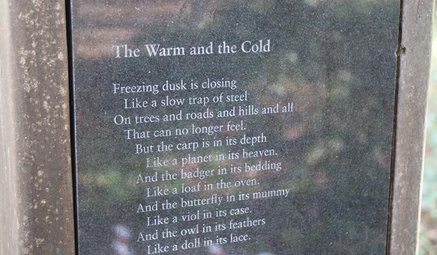 The Ted Hughes Poetry Trail has been created at Stover Country Park to celebrate his poetry and long-standing links with Devon. Visitors to the Trail can read examples of Hughes' finest poems relating to the natural world. These poems have been chosen with the help of Carol Hughes to relate to the wildlife to be seen and heard around the Country Park. The Park features sixteen specially-designed 'poetry posts', each displaying a poem by Ted Hughes on a theme relating to the natural world.