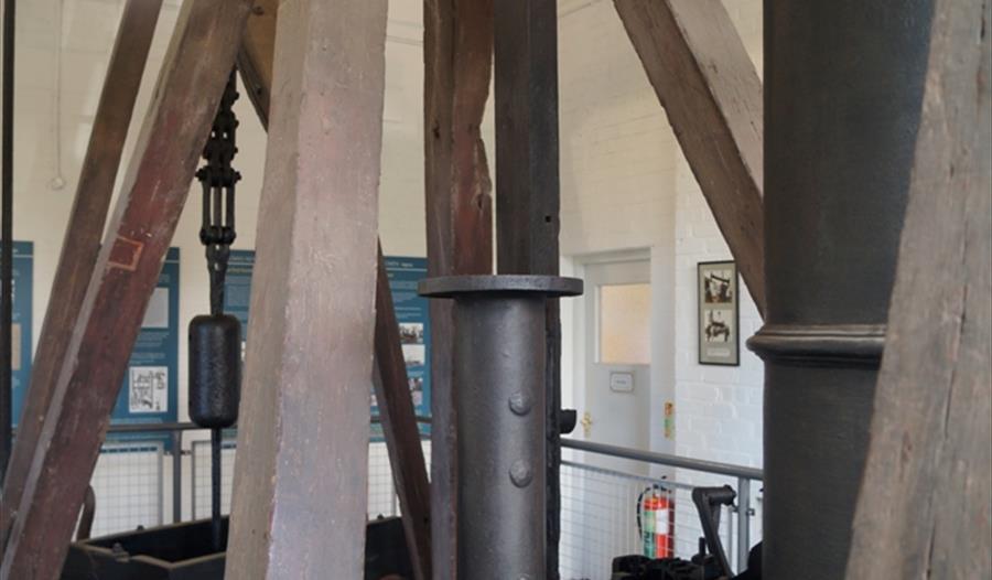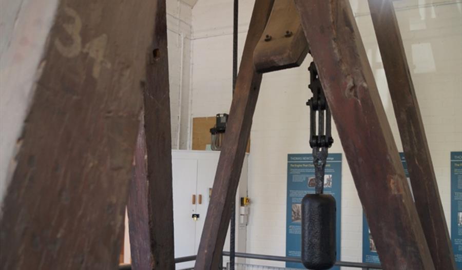 The Dartmouth engine shows most of the features of the earliest Newcomen engines. It has a simple, untrussed, wooden beam with arch heads, chain connections and wooden spring beams all believed to be original. The valve mechanism is more recent, but is activated automatically by a plug-rod, as in the early engines. However, there is one significant later feature in the shape of a ‘pickle-pot’ condenser, fitted directly beneath the cylinder. The engine can be operated by a hydraulic mechanism, so that the visitor can observe the motion of the engine and the operation of the valves.