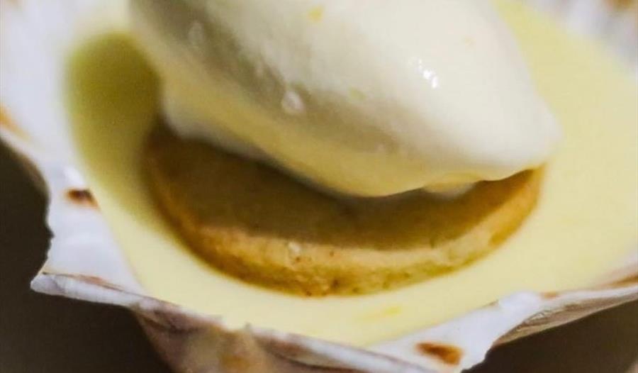 Set lemon cream, Devon short Bread, clotted cream ice cream with honey & cod roe sauce