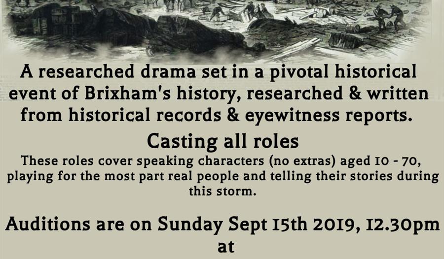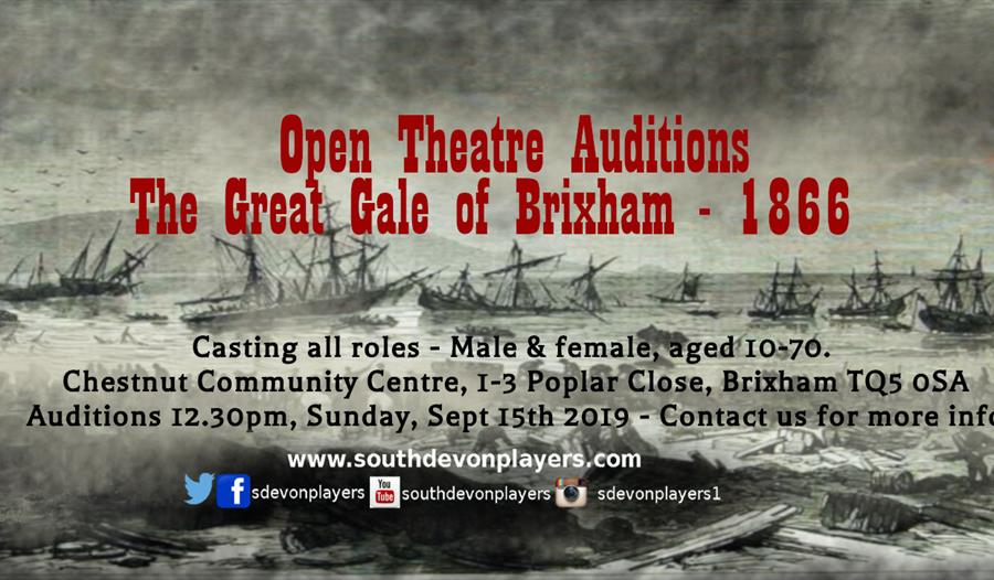 Auditions are on Sunday Sept 15th 2019, at Chestnut Community centre, 1-3 Poplar Close, Brixham, Devon TQ5 0SA. Please arrive to begin at 1pm. (doors open from 12).