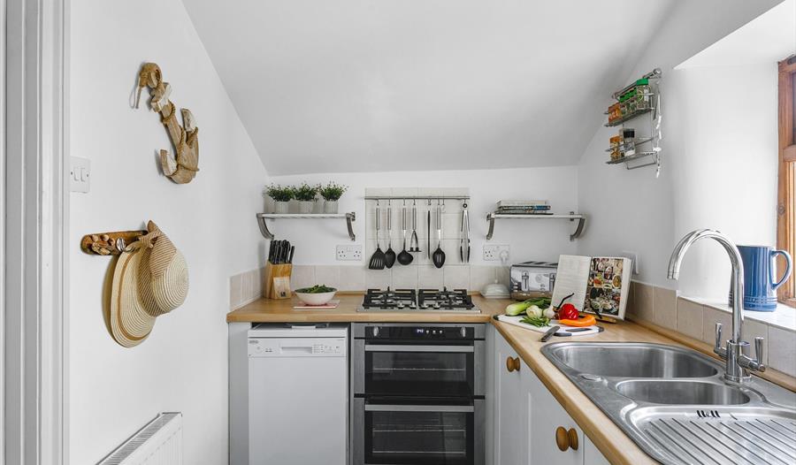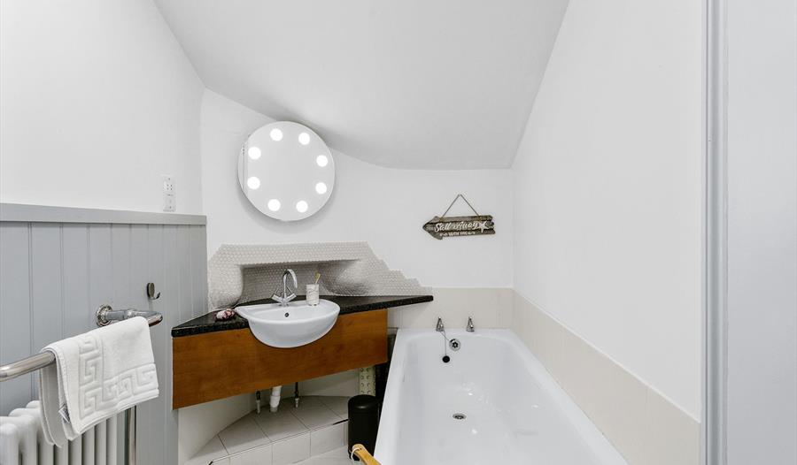 On the ground floor you’ll find an inviting sitting room with ample plush seating, a TV and wood-burning stove. Also on this floor there’s a lovely kitchen which overlooks the courtyard, a family bathroom, and a generous separate dining area with fireplace and space for six guests. The cottage’s three bedrooms are upstairs and include a spacious master with king size bed, a second king (configured to twins on request), and a small double. All are bright and airy with comfy beds and crisp linen.