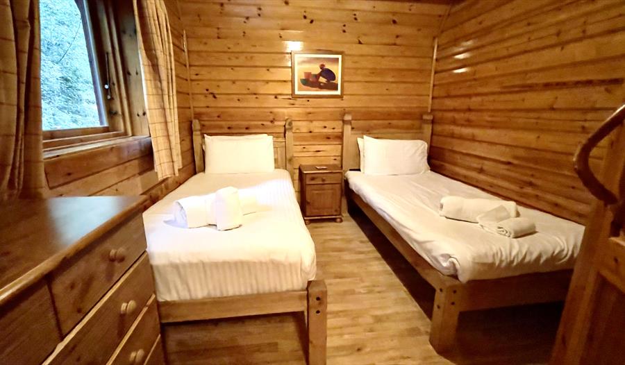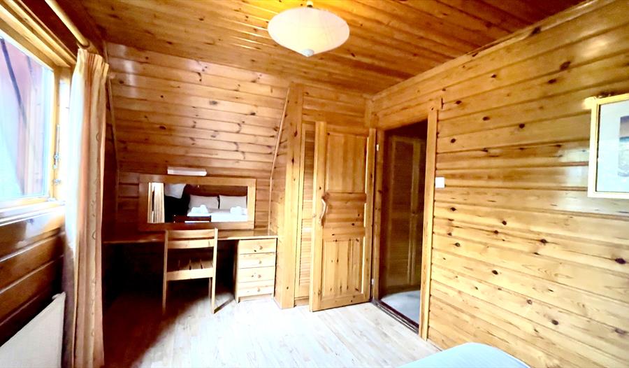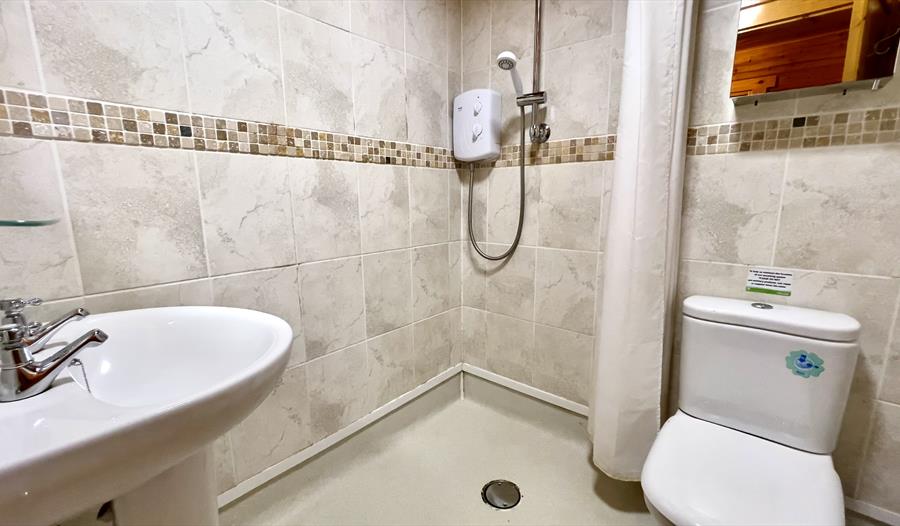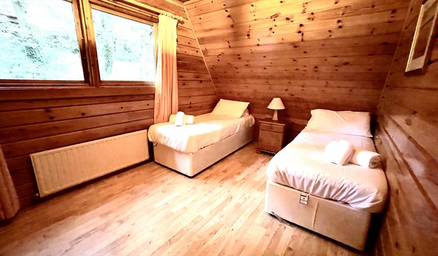 Welcome to Cowslip Lodge, nestled in the serene beauty of 130 acres of Devonshire countryside. Step inside the lodge through the inviting porch into a spacious hall, complete with a coat hanger and mirror. On the left-hand side, you'll find a cozy twin bedroom with two single beds, a wardrobe, cabinet, and a bedside unit. Across from the downstairs bedroom, there is a convenient shower room with a toilet, along with a separate secondary toilet.