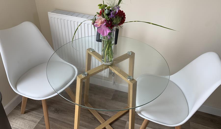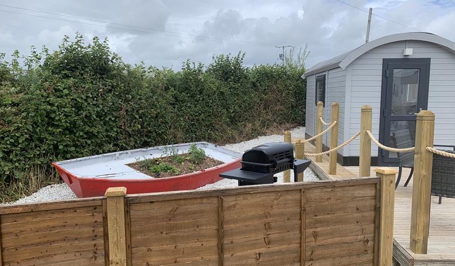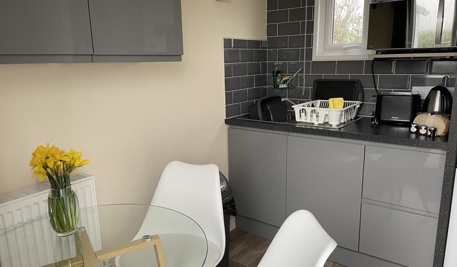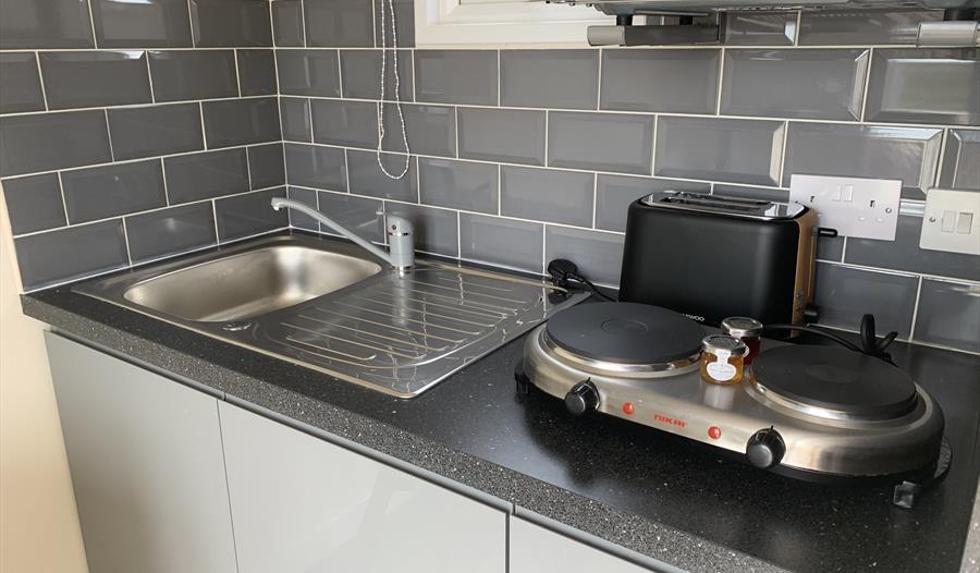 Next to the Shepherds Hut (you do have to go outside) you have your own micro kitchen with a small dining area. For your convenience the kitchen is furnished with a fridge/freezer, microwave, kettle, toaster, hot plate and air-fryer, along with crockery and utensils. A welcome pack of tea, coffee, sugar and milk are provided for you.
