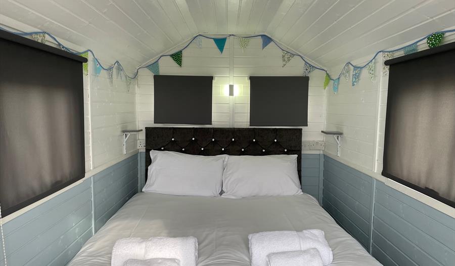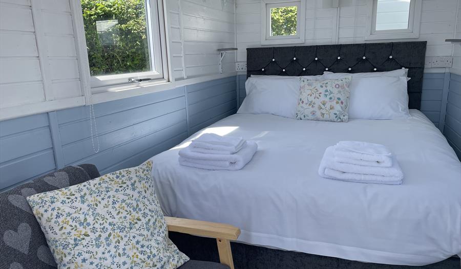Estuary View is furnished with a luxury 5ft double bed, prepared with boutique quality linens, enabling you to have a relaxing and comfortable night's sleep. Within the hut there is also a small sofa, TV, clothes hanging and storage shelves.