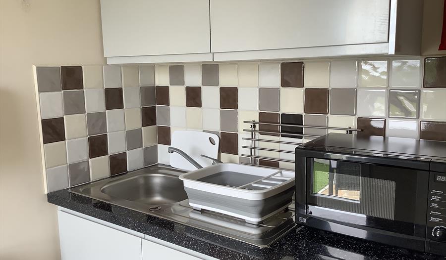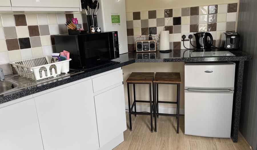 The open plan room leads into a micro kitchen with breakfast bar dining area. For your convenience the kitchen is furnished with a fridge/freezer, microwave, kettle, toaster, hot plate and air-fryer, along with crockery and utensils. A welcome pack of tea, coffee, sugar and milk are provided for you.
