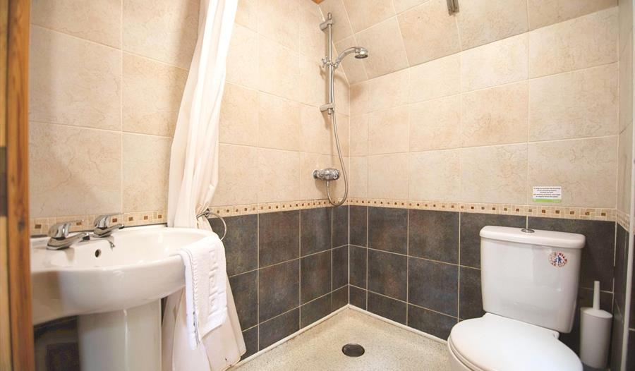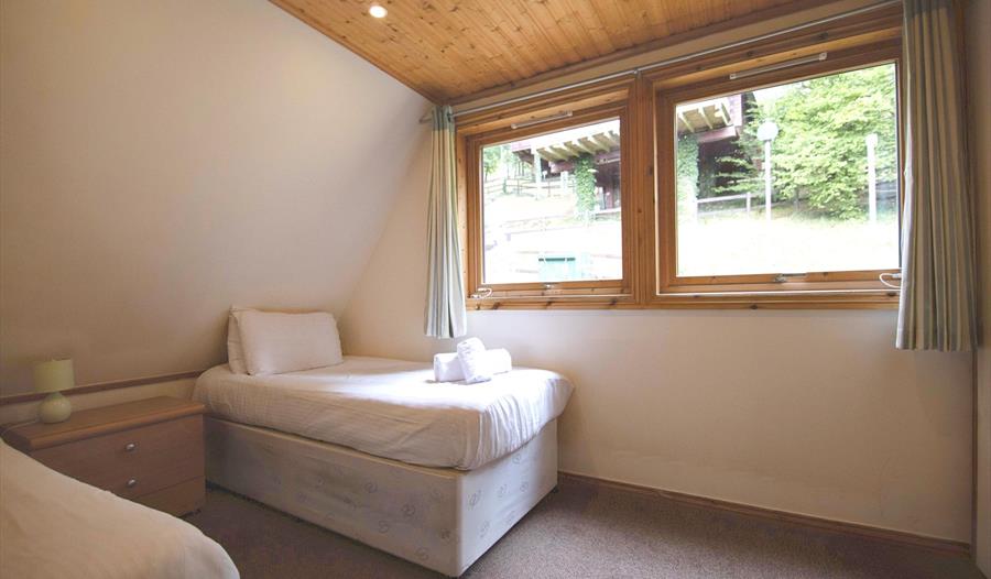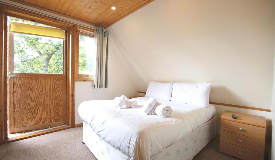 Lazy Bear Lodge accommodates up to four individuals across two generously-sized bedrooms — a double room, with a Juliet balcony, and a twin room. The contemporary lounge provides ample space for relaxation, adorned with large windows that offer stunning views. It is furnished with comfortable sofas, an coffee table, a set of nesting tables, and a Smart TV.