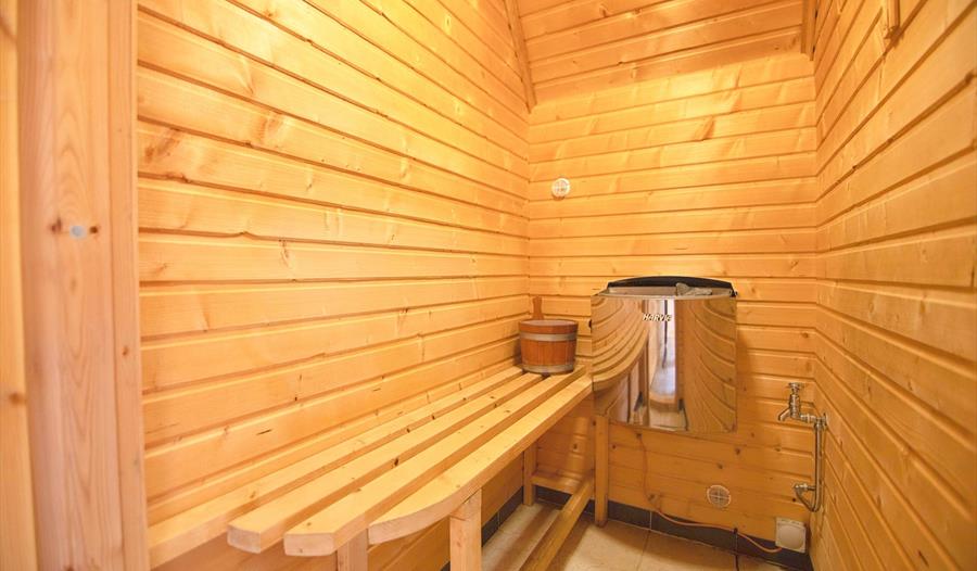Adjacent to the lounge is a private sauna, perfect for unwinding. The modern kitchen/dining area features a rectangular wooden table and four faux leather chairs. Upstairs, you will find two spacious bedrooms with dressing tables.