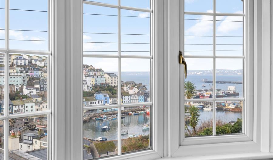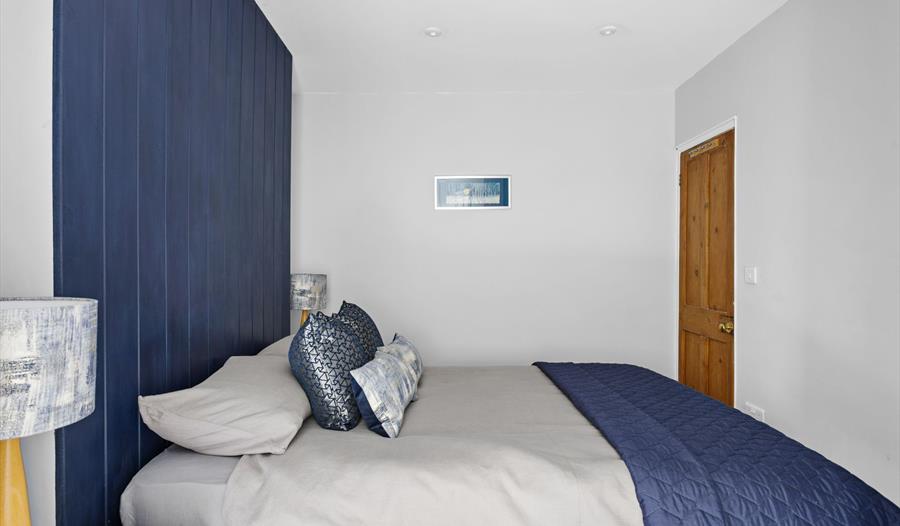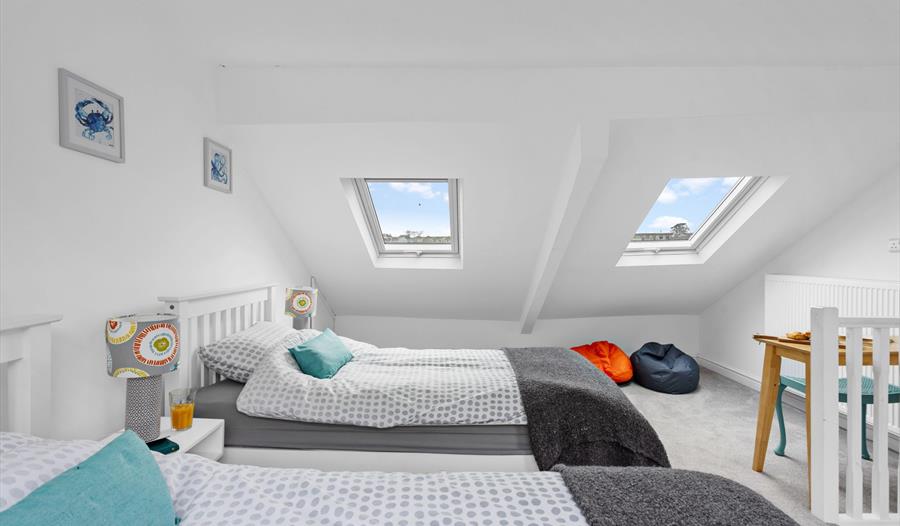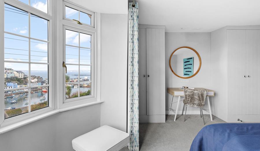 Three bedrooms are situated on the cottage's top two floors. The tasteful first-floor master bedroom with its harbour-facing bay window and sumptuous king-size bed is a dream. The second bedroom (also on this floor) is a light-filled double with elegant décor and an en-suite shower room. Upstairs, a third light-filled bedroom has vaulted ceilings and twin beds, with a birds-eye view of the town, harbour and sea.