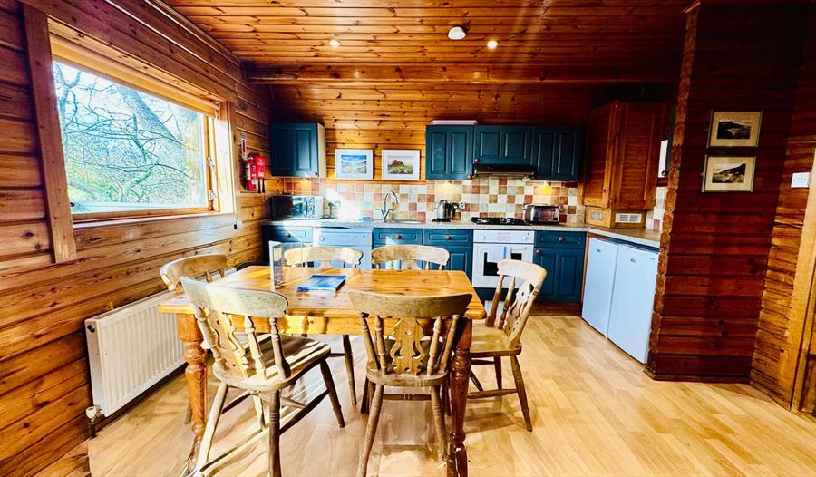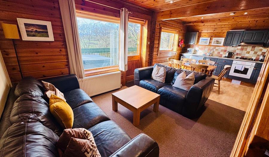 The open‑plan lounge, kitchen, and dining area is bright, contemporary, and finished with high‑quality flooring throughout. The lounge features two comfortable leather sofas, a stylish coffee table, a Smart TV, and free Wi‑Fi - perfect for cosy evenings together.